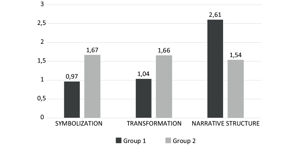 Figure 1 represents the diagram of results of children’s narratives assessment in contrasting groups, by individual parameters: “Symbolization”, “Transformation”, and “Narrative Structure”. One can notice that in respect to the use of symbol and transformations (i.e. “Creative abilities” cluster), the group with a higher education quality was ahead of the less advanced group. Interestingly, when it comes to “Narrative Structure”, the situation is reverse; yet, the difference was significant as well.